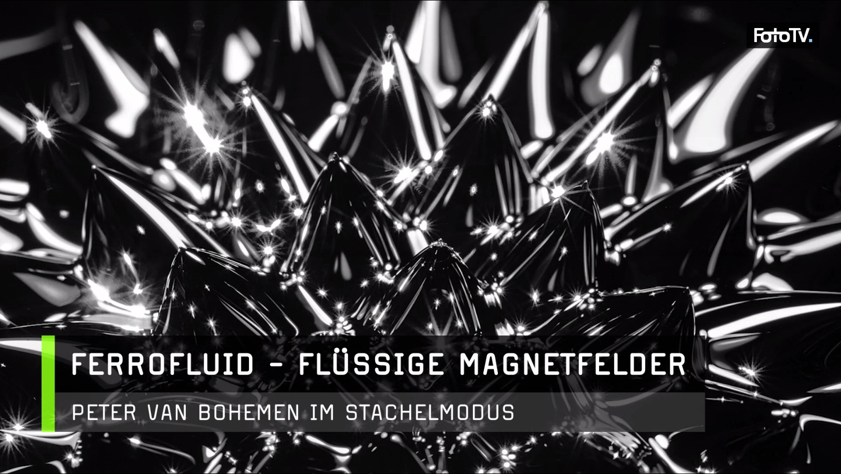 Ferrofluid ist ein öliges Schmiermittel, das feinste Eisenpartikel enthält und daher stachelförmige Strukturen bildet, wenn es unter Einfluss von Magnetfeldern steht. Dieses spannende Phänomen nutzt der Fotokünstler Peter van Bohemen und zeigt in diesem Video-Beitrag von FotoTV, wie sich außergewöhnliche Fotografien erzeugen lassen, wenn man die Mikrolandschaft zusätzlich mit bunten Leuchtdioden ausleuchtet.