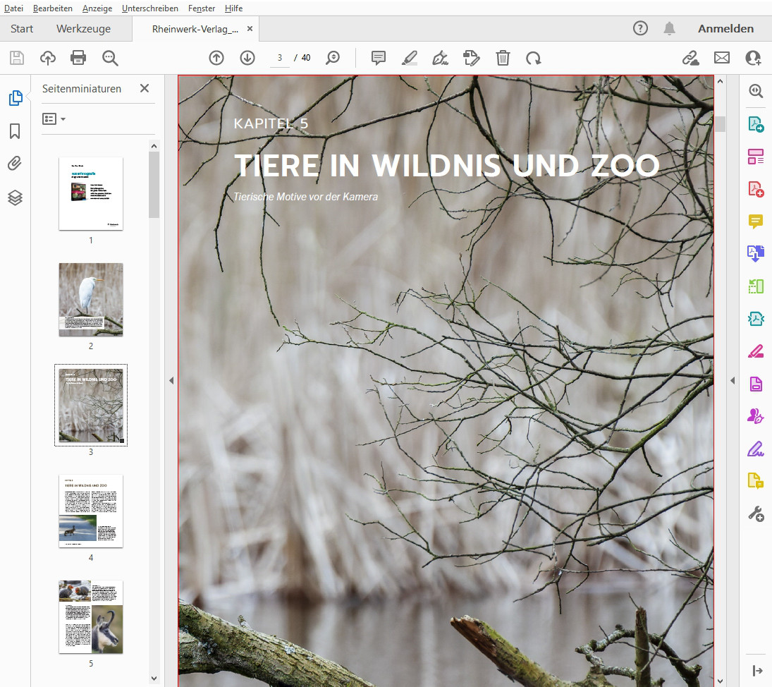 Anders als beim Fotografieren von Menschen lassen sich Tiere in der Regel nicht vor der Kamera dirigieren oder gar zu bestimmten Aktionen überreden. Zwar gibt es sowohl hierzulande als auch in exotischen Regionen Orte, an denen man wilde Tiere nicht lange zu suchen braucht, sie zuweilen sogar einfacher zu fotografieren sind als in manchem Zoo, dennoch ist – neben biologischen Kenntnissen – Geduld wohl die wichtigste Voraussetzung für einen ambitionierten Tierfotografen. In diesem Auszug aus Kapitel 5 "Tiere in Wildnis und Zoo" des Buchs (PDF) beschäftigt sich der Naturfotograf insbesondere mit folgenden Themen: