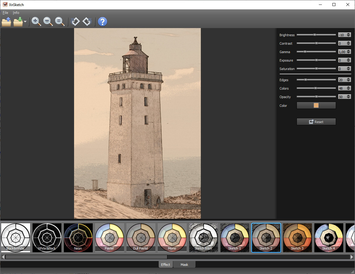 Wandelt Digitalfotos in Cartoon- oder Skizzenbilder um; bringt dazu 18 Effekte wie verschiedene Pinselstriche, Bleistift- oder Buntstiftskizzen mit und ermöglicht das individuelle Einstellen von Rahmenstärke und Transparenz sowie Kontrast, Helligkeit und Sättigung; unterstützt alle gängigen Bildformate und kommt ohne Installation aus.