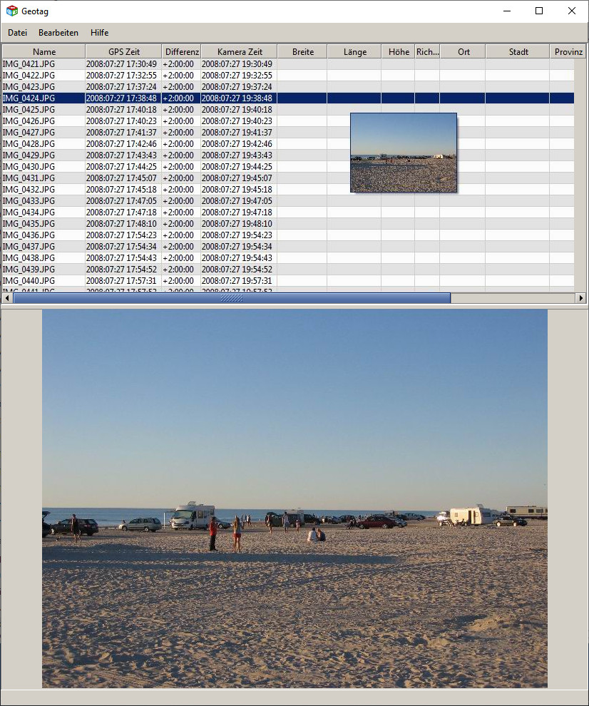 Fügt den EXIF-Daten von Bildern parallel aufgezeichnete GPS-Daten hinzu. Anhand von Datum und Zeit gleicht Geotag EXIF- und GPS-Aufzeichnungsdaten ab und ordnet dem Foto die entsprechenden Daten zu. Die Software kann Google Earth und Google Maps zur Ortsbestimmung nutzen. Nutzt ExifTool sowie GPSBabel und erfordert Java Runtime Environment (JRE); hier gibt es zusätzlich den Quellcode.