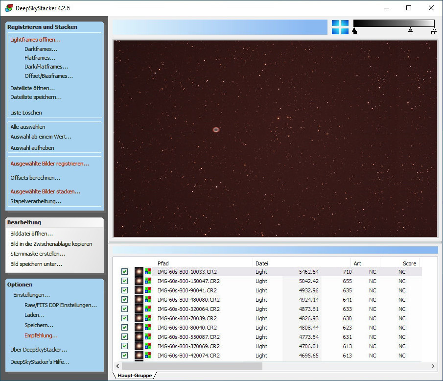 Bildbearbeitung für Astrofotografen; bereitet Fotos durch Stacking auf und enthält eine schnelle Vorschaufunktion; fertige Bilder werden wahlweise als TIFF- oder FITS-Datei in 16 oder 32 Bit ausgegeben; nachfolgend gibt es zusätzlich die Quellcodes für die Version 4.2.6 bzw. Version 5.1.5.